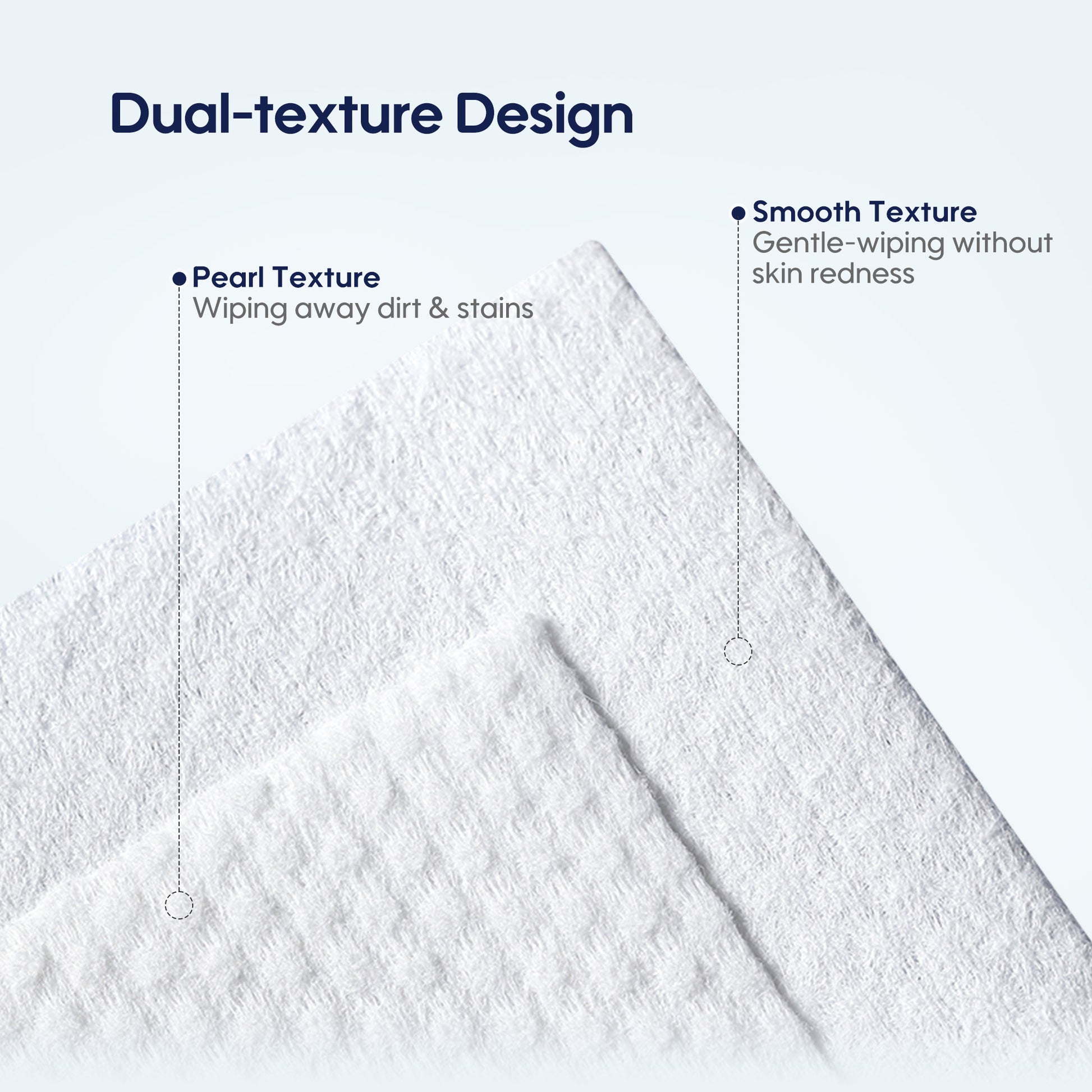 The Gentle Soft Series features wipes made from natural plant fibers with a dual texture design—pearl and smooth—perfect for all cleaning needs. Infused with soothing aloe vera, each oversized wipe provides exceptional comfort for sensitive skin. Designed for single dispensing to minimize waste, our gentle formula is free from harmful substances, ensuring safe use for your little one.